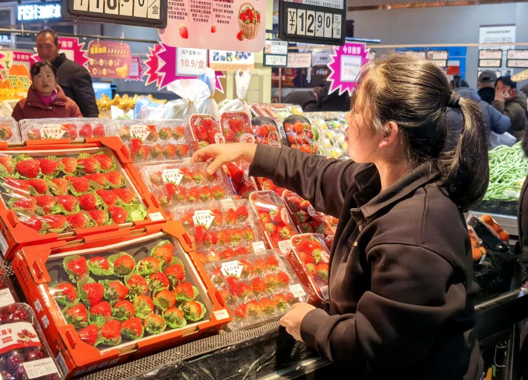 转到家家利超市,“迎春开门红”的装饰映入眼帘,空气中飘散着坚果炒货的诱人香气。从去年12月26日至今年1月8日,超市打造的“草莓季”“陶瓷节”“炒货节”等主题展区,吸引了众多顾客停留选购。鲜红饱满的草莓、精美喜庆的陶瓷餐具尤其受欢迎,相关货品备货量较平日增加了50%,供应依然充裕。