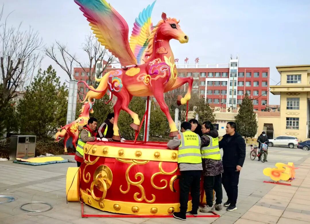 工人们身着统一工装,有条不紊地进行着——这边几人合力抬起沉重的灯架,那边有人仔细校准安装位置,还有工人正熟练地固定着灯体。随着各环节工作的推进,一尊昂首挺胸的骏马花灯逐渐呈现在众人眼前。灯身线条流畅,姿态昂扬,虽未点亮,已显露出勃勃生机。路过群众纷纷驻足观看,孩子们更是雀跃地围到灯旁,一张张小脸上写满了期待与欢喜。