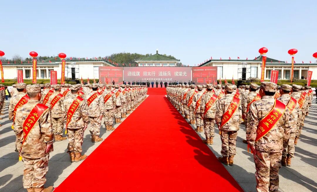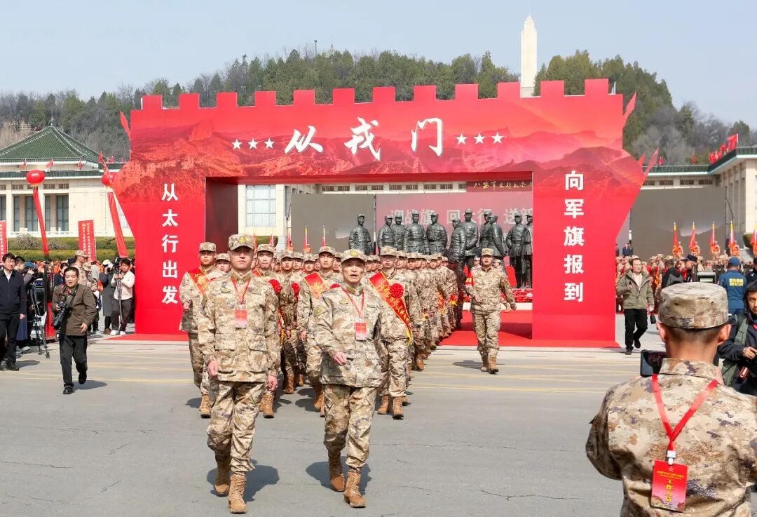上午10时,仪仗队员们护卫着承载光辉历史的功勋战旗整齐入场,新兵们身着崭新军装,怀着对革命先辈的崇敬,迎战旗、接战旗,向战旗庄严敬礼,齐声诵读太行精神,并庄严宣誓。