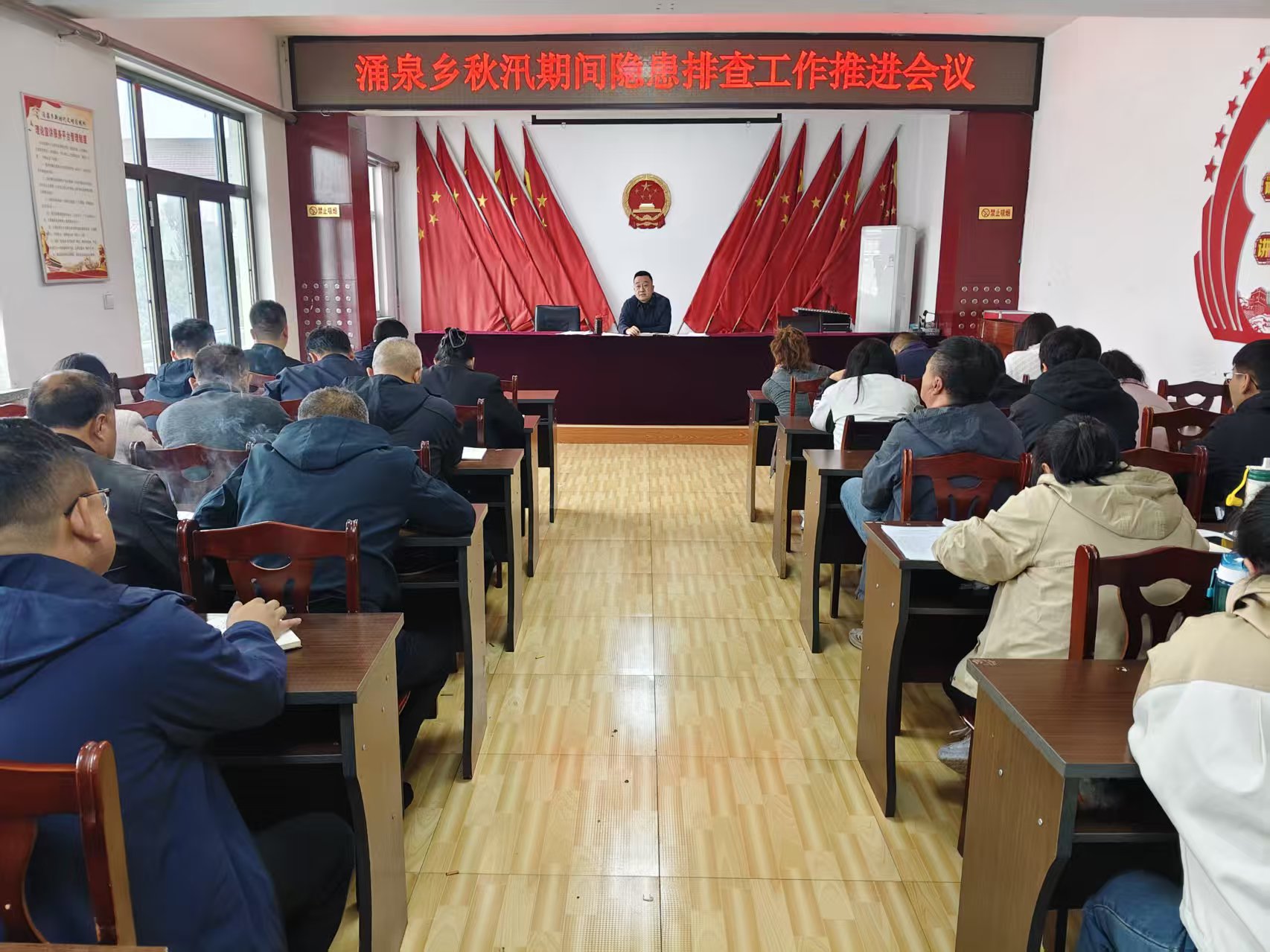 10月9日,涌泉乡召开秋汛期间隐患排查工作推进会议。乡党委书记贾宝主持,会议就各村要全面开展地质灾害隐患排查工作,不漏隐患;要确保值班人员在岗在位,突发情况能快速响应。要求各项工作须落到实处,切实保障群众生命财产安全。全体乡干、到村工作大学生、选调生、各村支书主任参加会议。