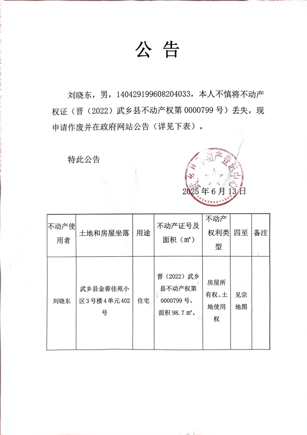 武乡县不动产证丢失公告
