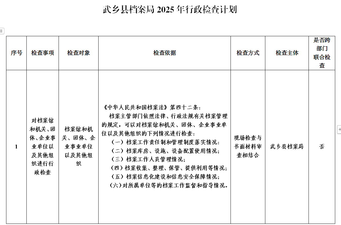 武乡县档案局2025年行政检查计划