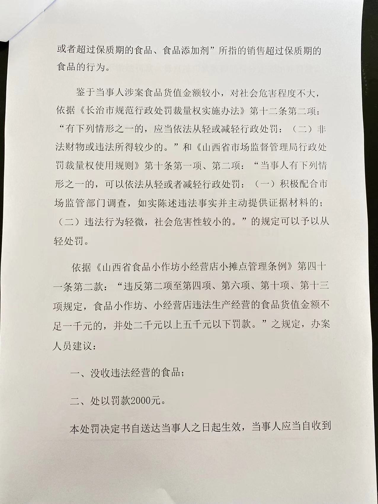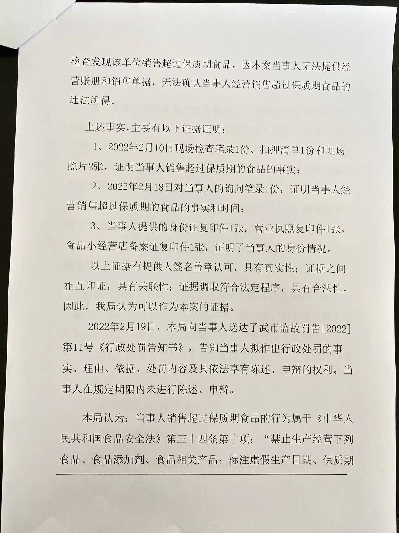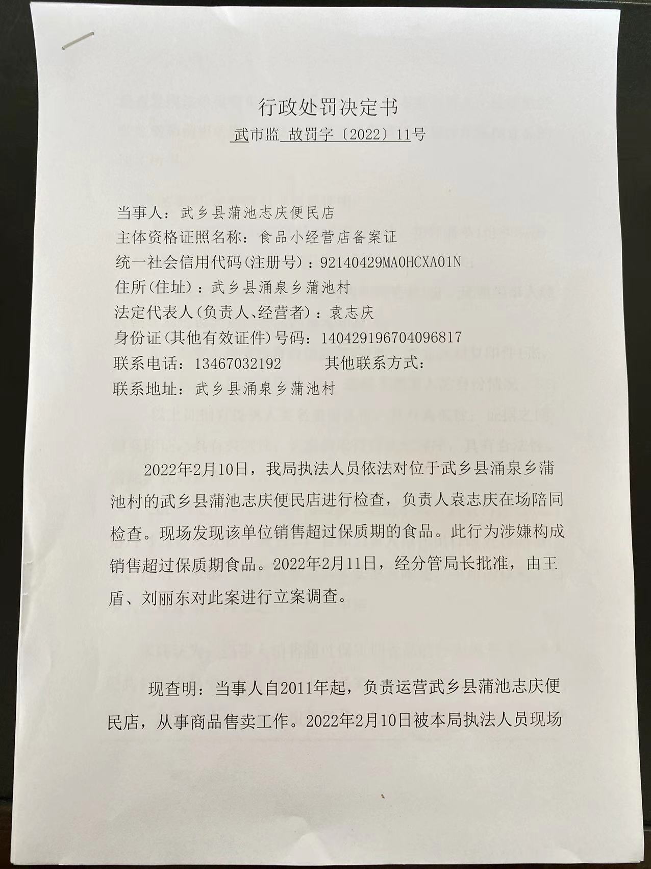 武乡县蒲池志庆便民店销售超过保质期食品案