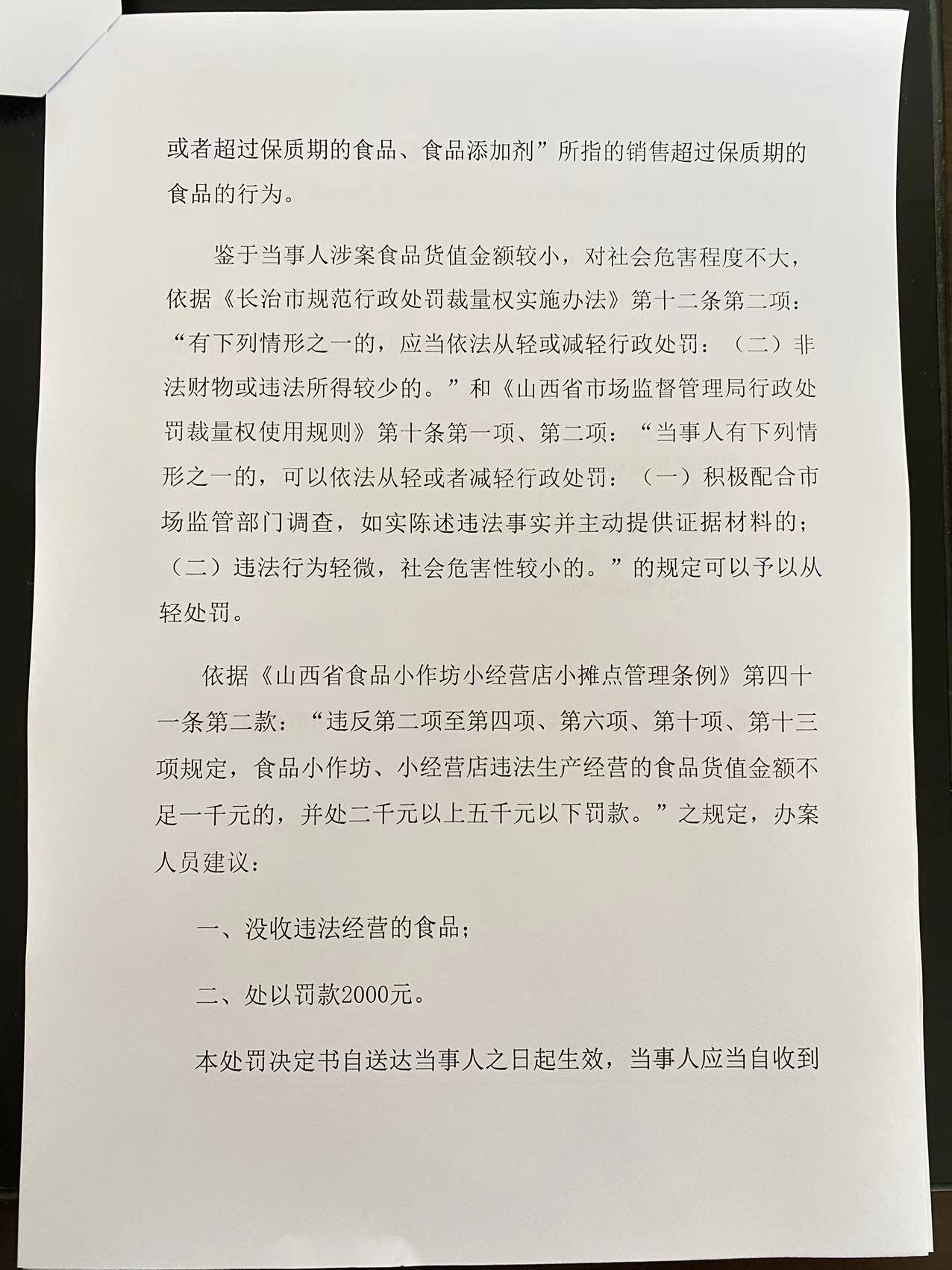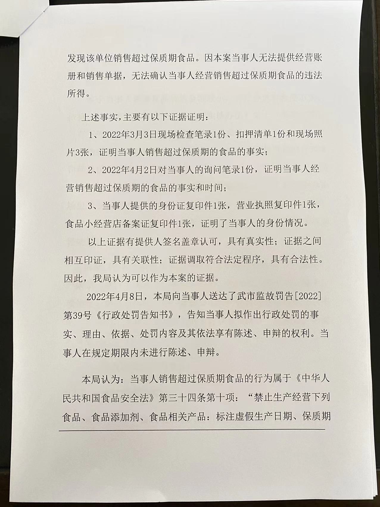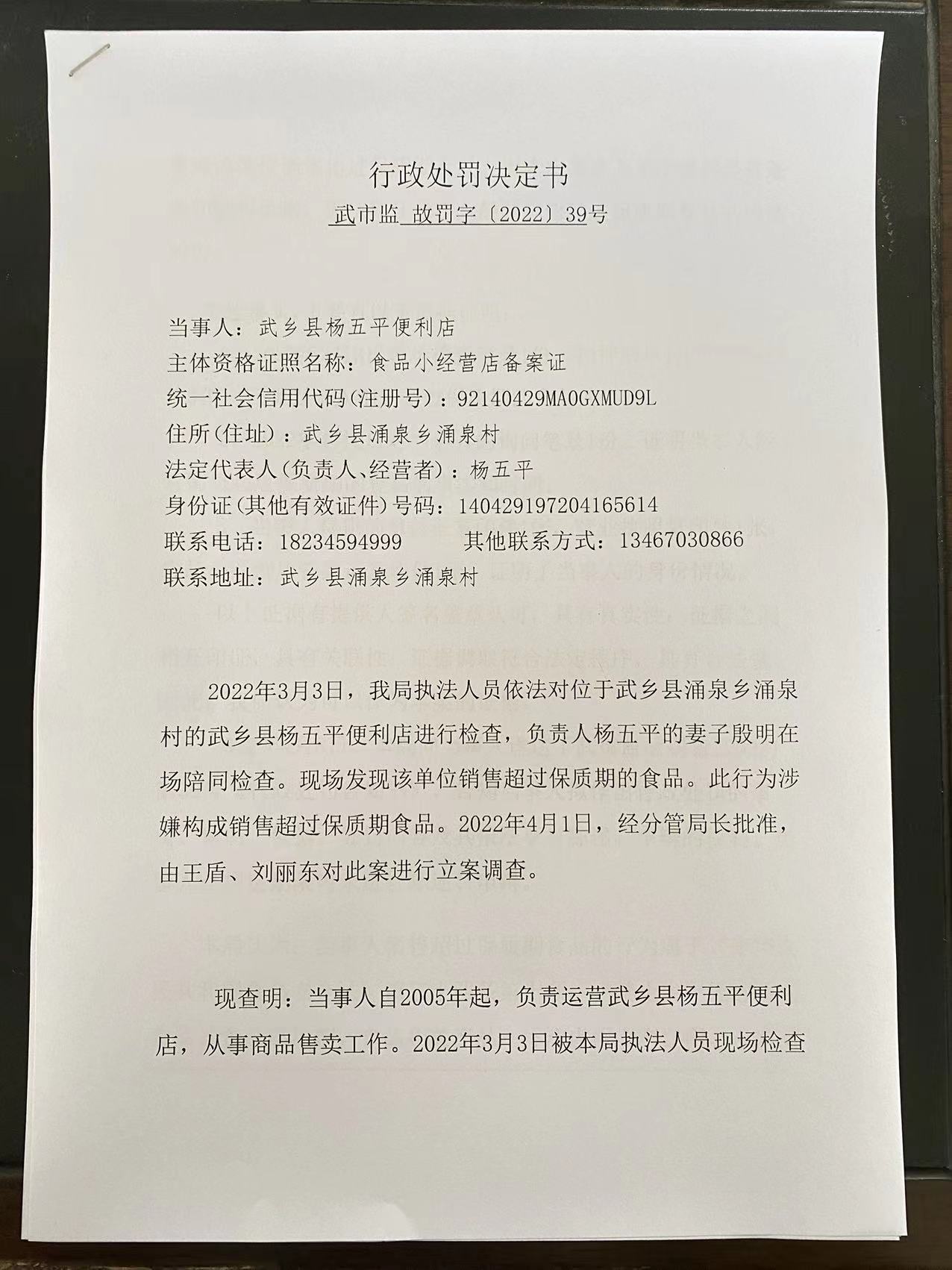 武乡县杨五平便利店销售超过保质期食品案
