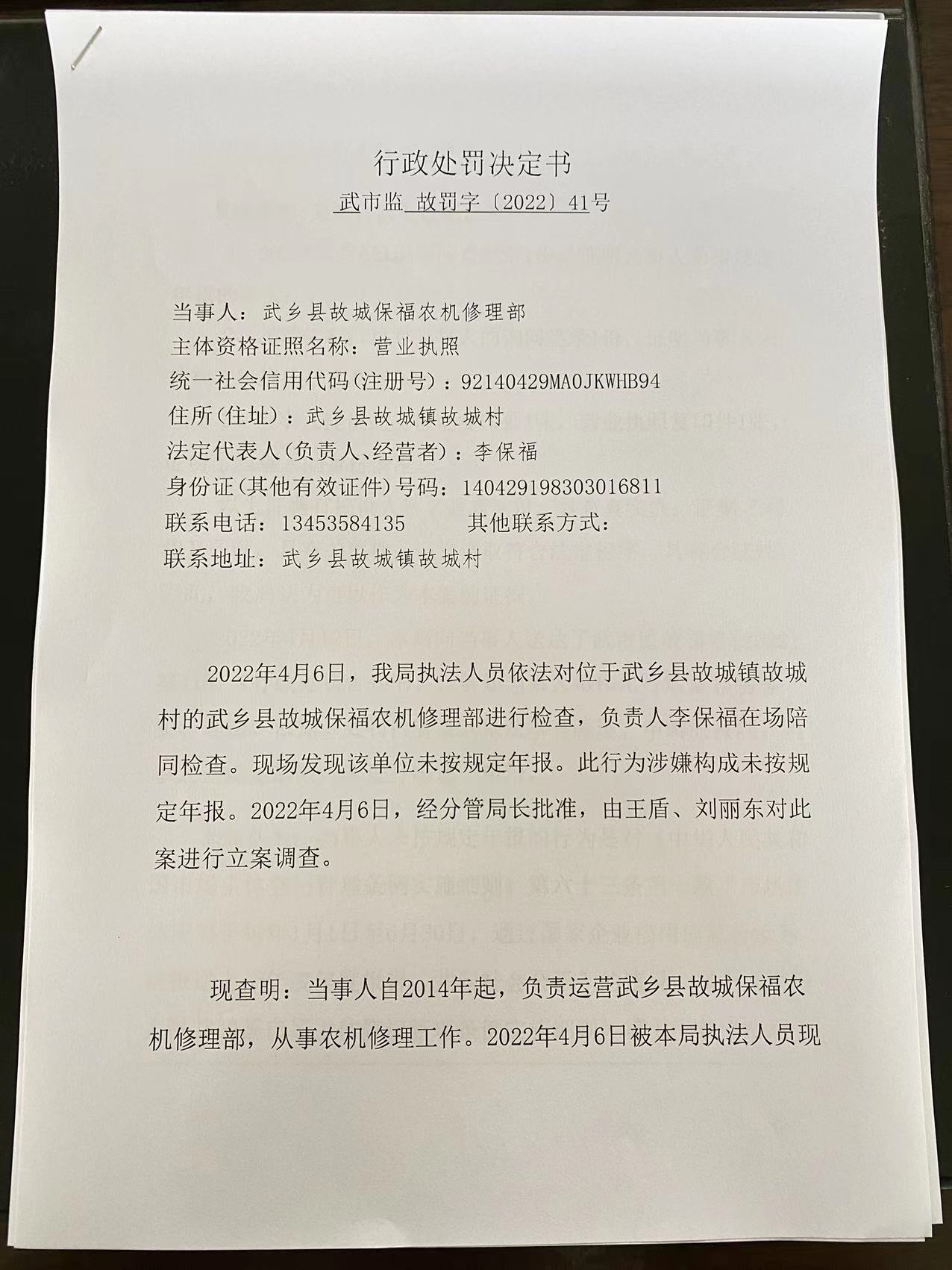 武乡县故城保福农机修理部未按规定年报案
