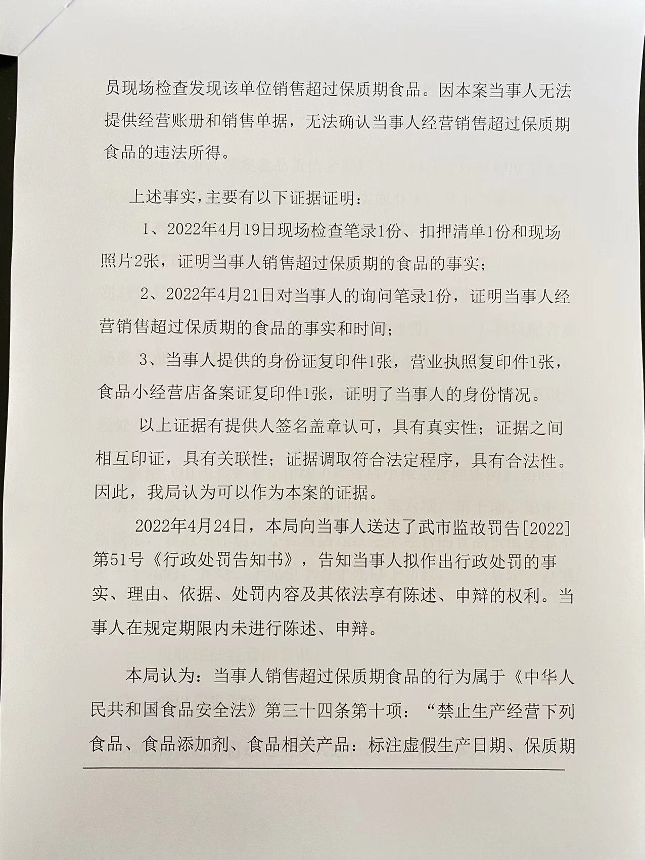 武乡县石北乡东河日用品超市销售超过保质期食品案