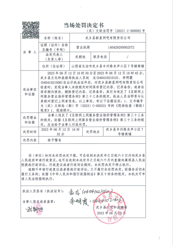 关于对新星网吧的处罚决定