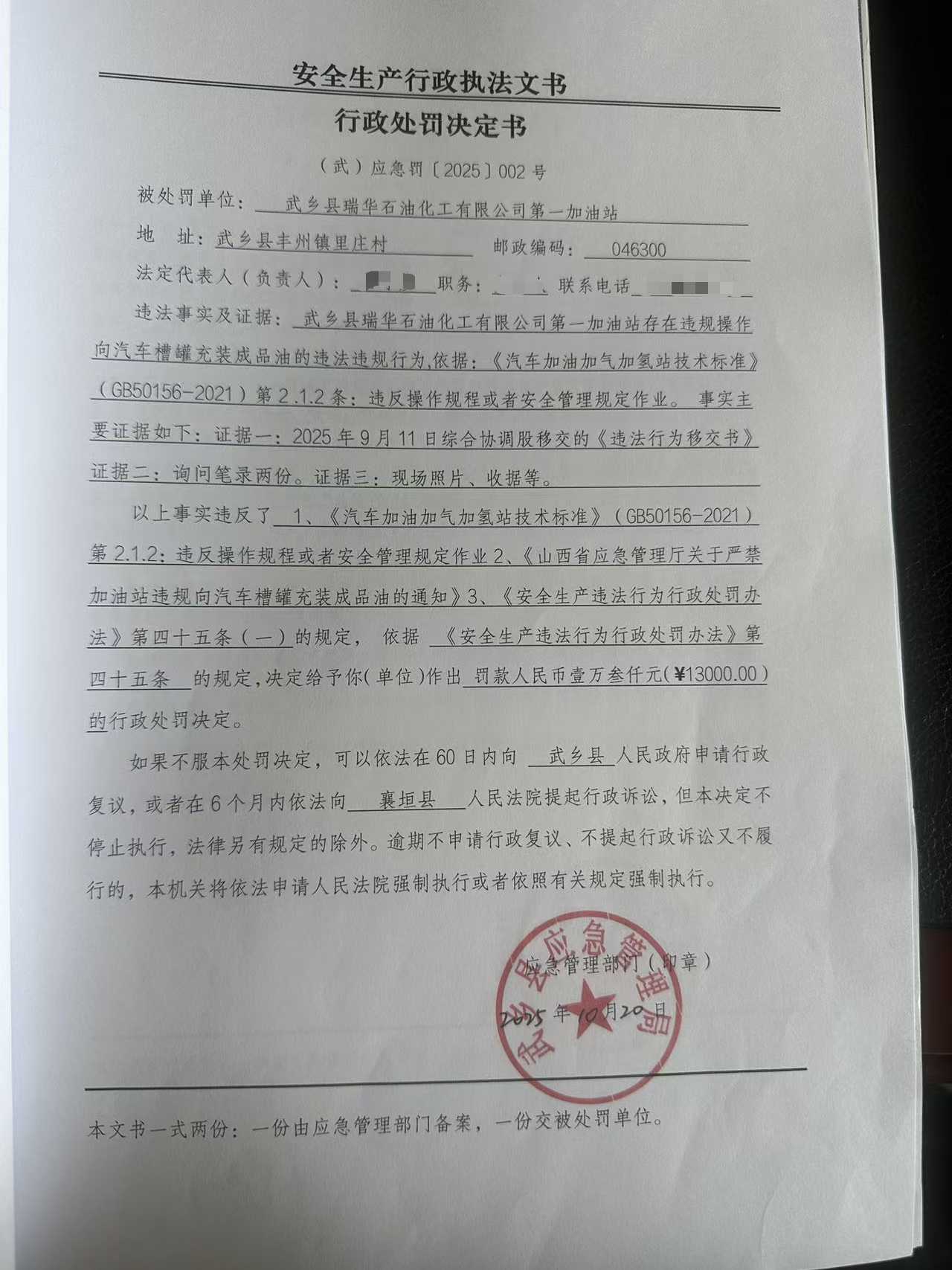 武乡县瑞华石油化工有限公司第一加油站行政处罚决定书