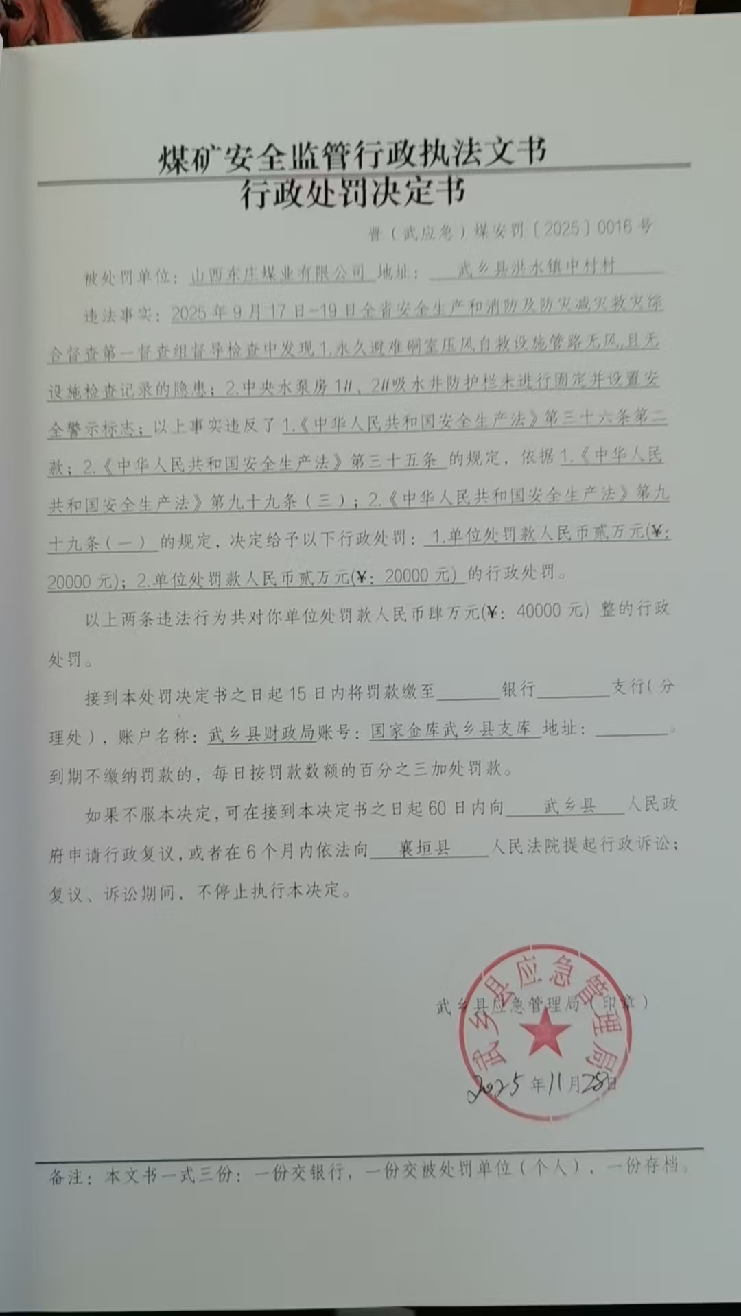 山西东庄煤业有限公司行政处罚决定书