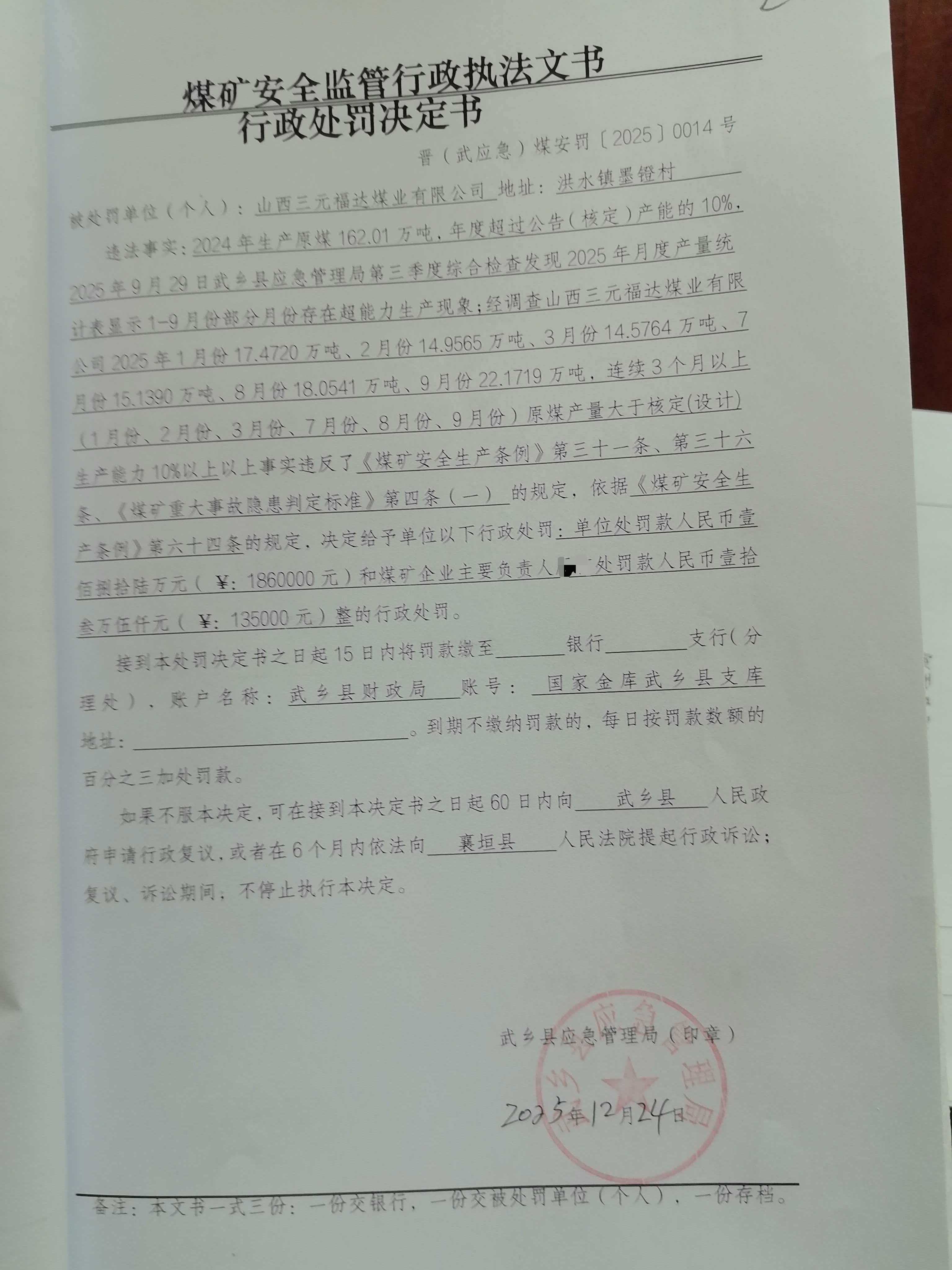 山西三元福达煤业有限公司行政处罚决定书